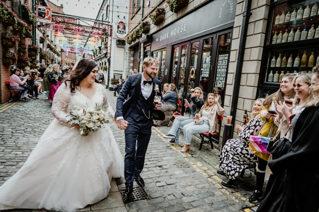 A short wander up to the Duke of York is a tradition for many couples. The walk itself is magic: cobbles, lights, strangers congratulating you, and that unfiltered Belfast joy. A couple of portraits there, maybe a pint of the black stuff… then back to the hotel.